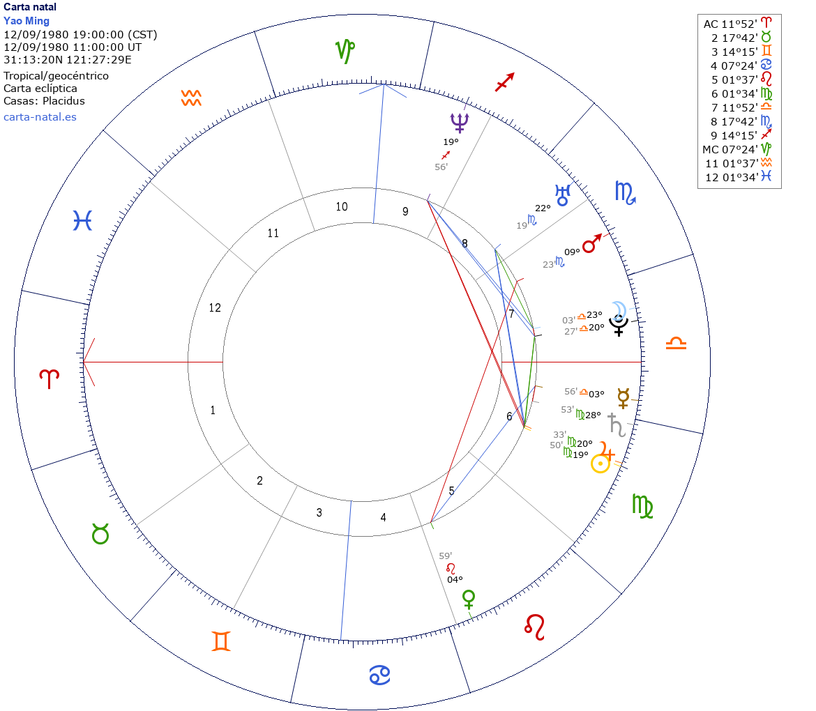 Yao Ming nació el 12 de Septiembre de 1980 a las 19:00:00 en Shanghai (Shanghái), China
