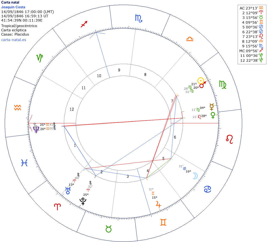Joaquín Costa nació el 14 de Septiembre de 1846 a las 17:00:00 en Monzón (Huesca), España