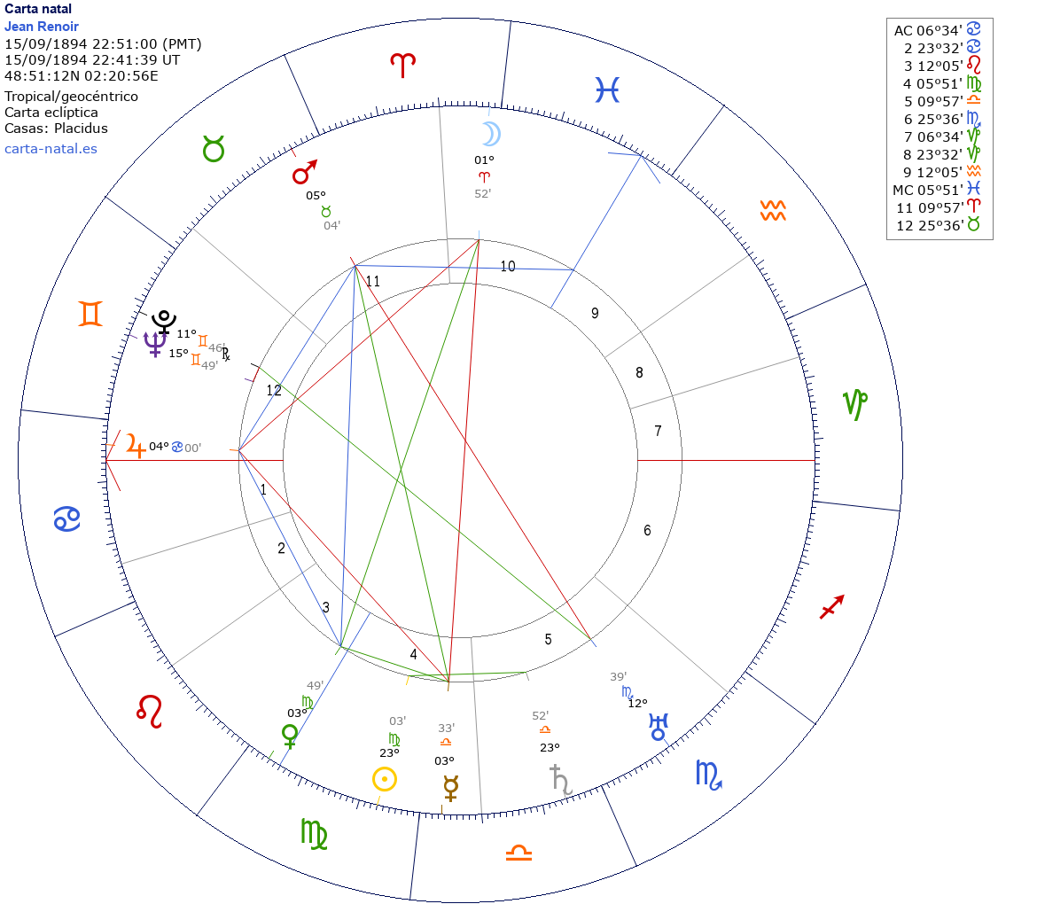 Jean Renoir nació el 15 de Septiembre de 1894 a las 22:51:00 en Paris (Isla de Francia), Francia