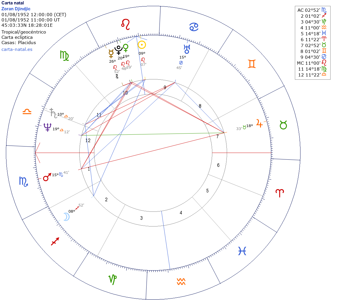 Zoran Djindjic nació el 1 de Agosto de 1952 a las 12:00:00 en Bosanski Samac (República Srpska), Bosnia y Herzegovina