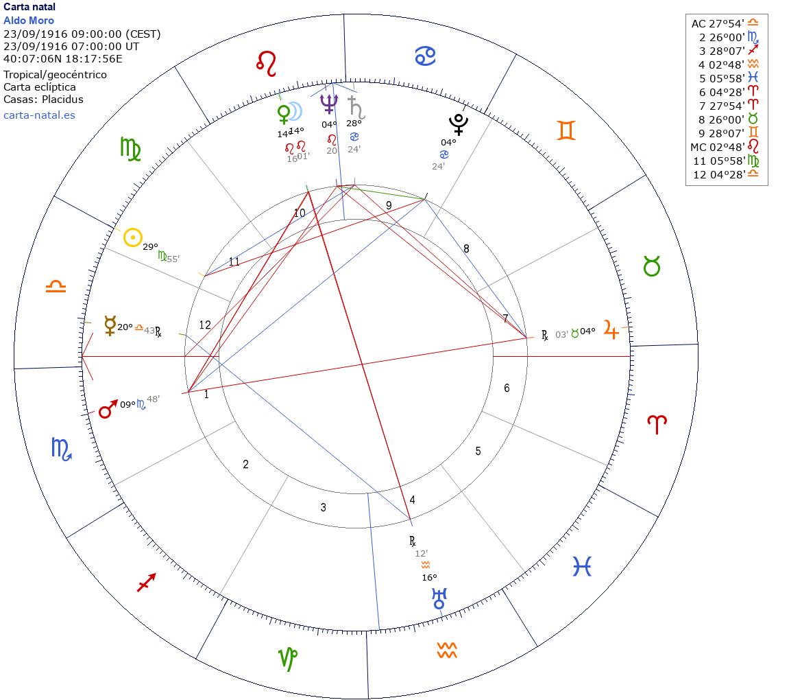Esta es la carta natal de Aldo Moro, político italiano.