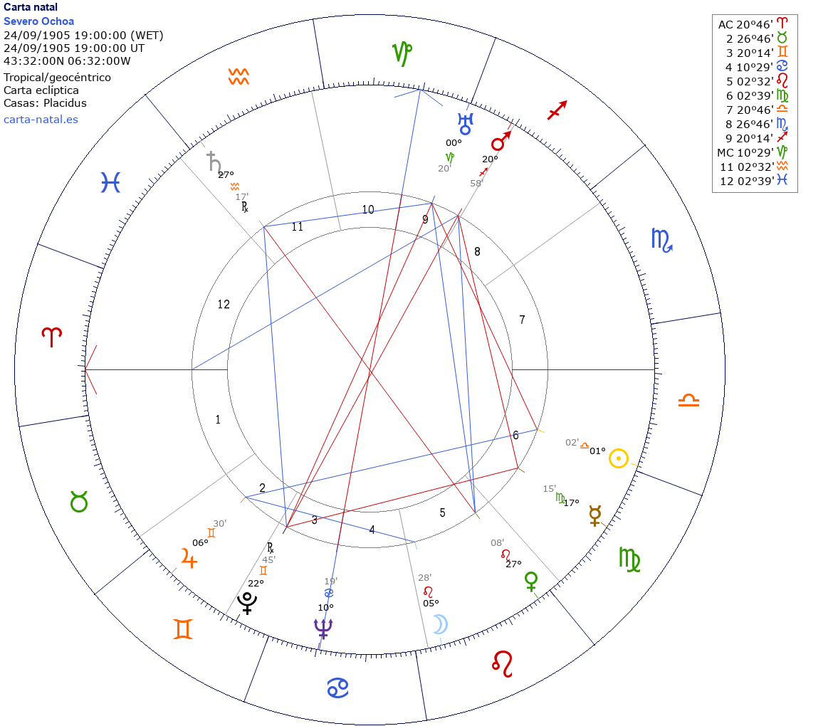 Esta es la carta natal de Severo Ochoa, bioquímico español, Premio Nobel de Química en 1959.