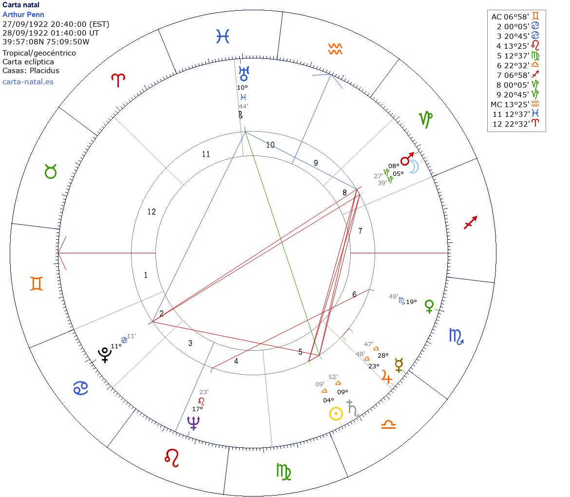 Esta es la carta natal de Arthur Penn, director de cine estadounidense.