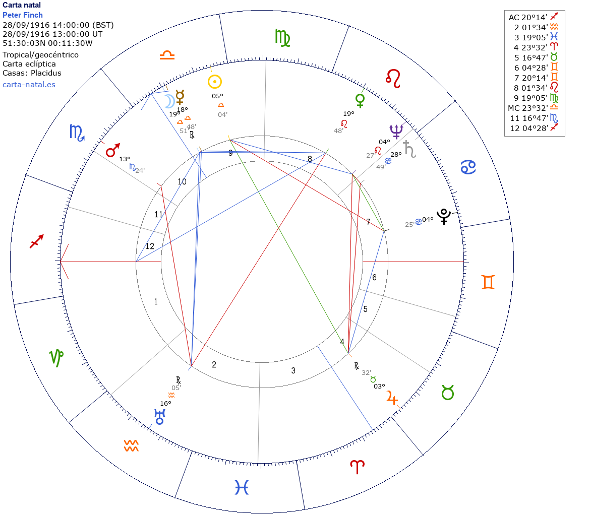 Esta es la carta natal de Peter Finch, actor británico (m. 1977).