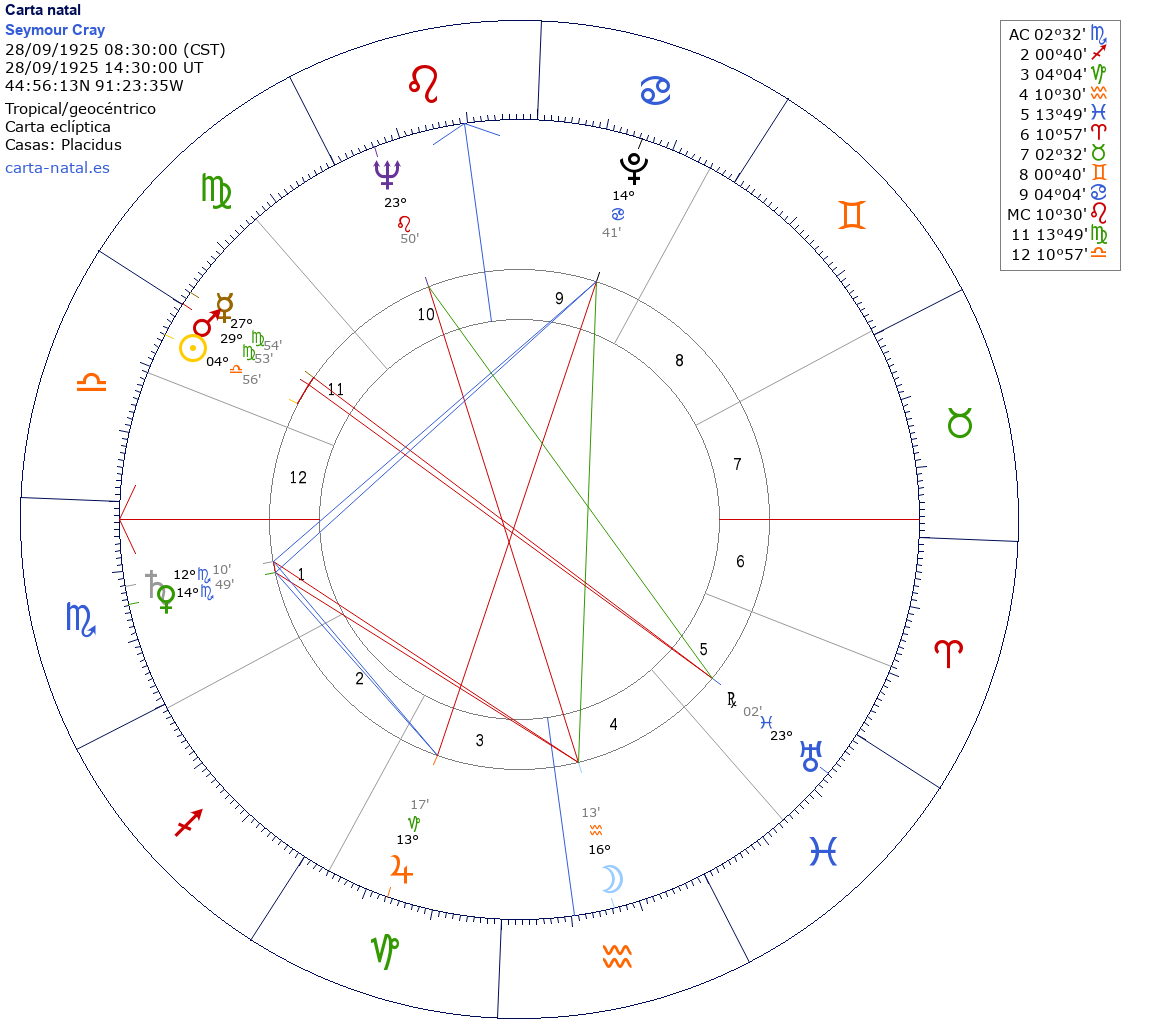 Esta es la carta natal de Seymour Cray, científico estadounidense, empresario de computadoras (m. 1996).