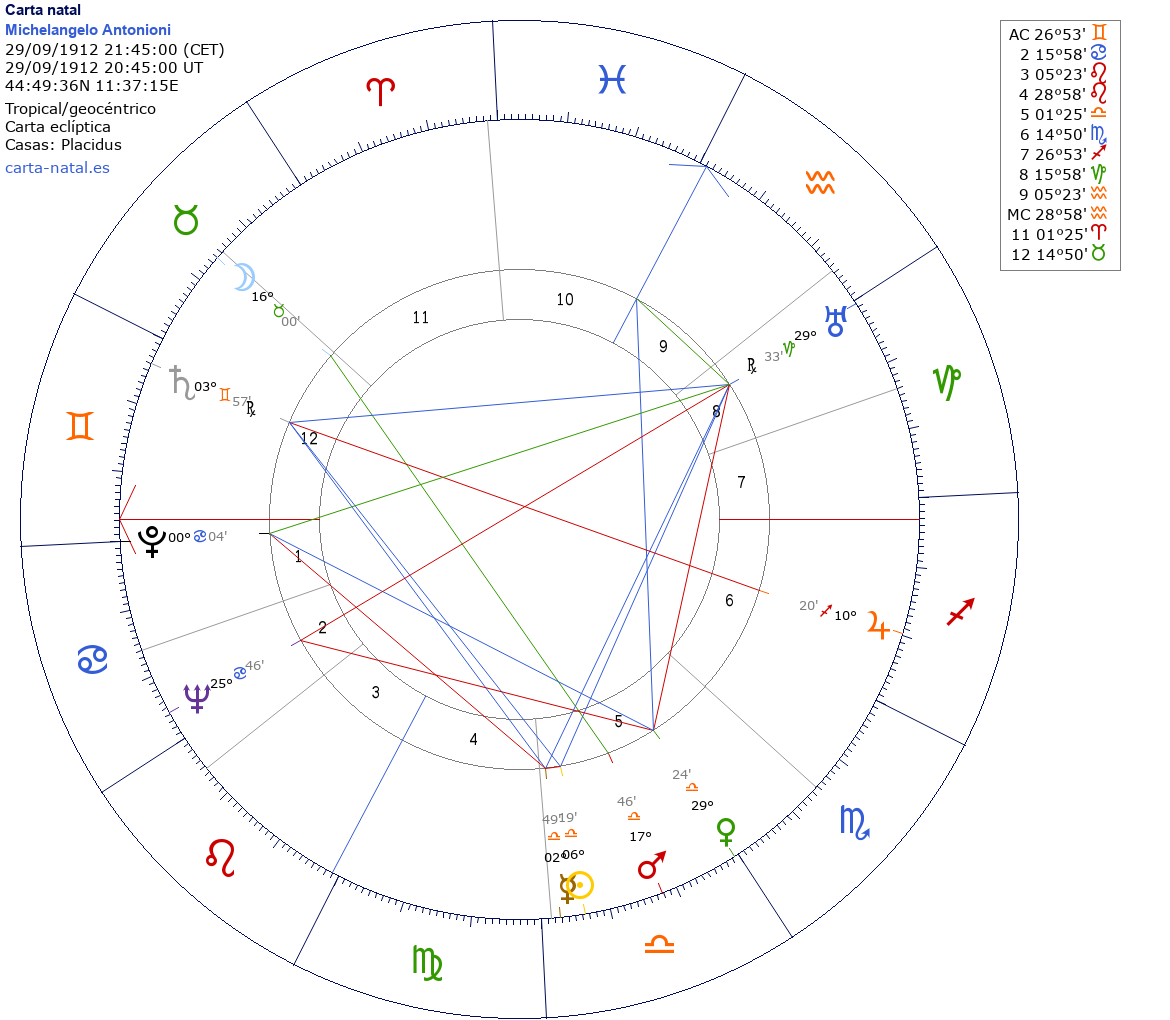 Michelangelo Antonioni nació el 29 de Septiembre de 1912 a las 21:45:00 en Ferrara (Ferrara), Italia