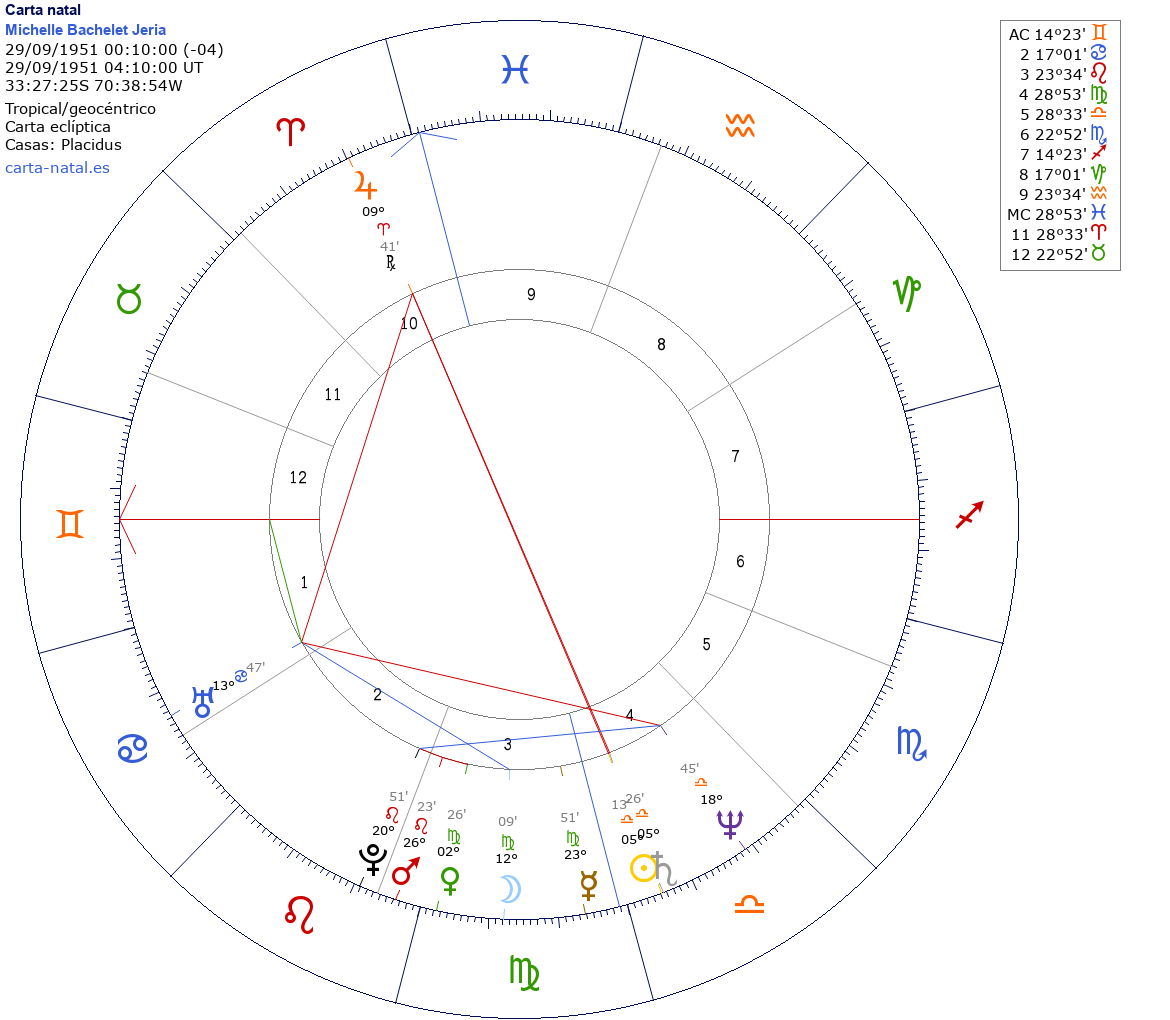 Esta es la carta natal de Michelle Bachelet, política chilena, presidenta de Chile desde el 2006.