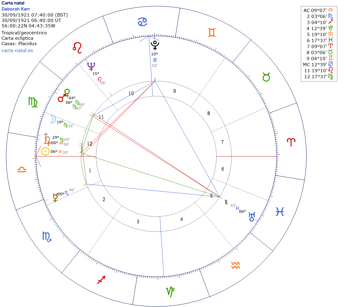 Esta es la carta natal de Deborah Kerr, actriz británica. (m. 2007)