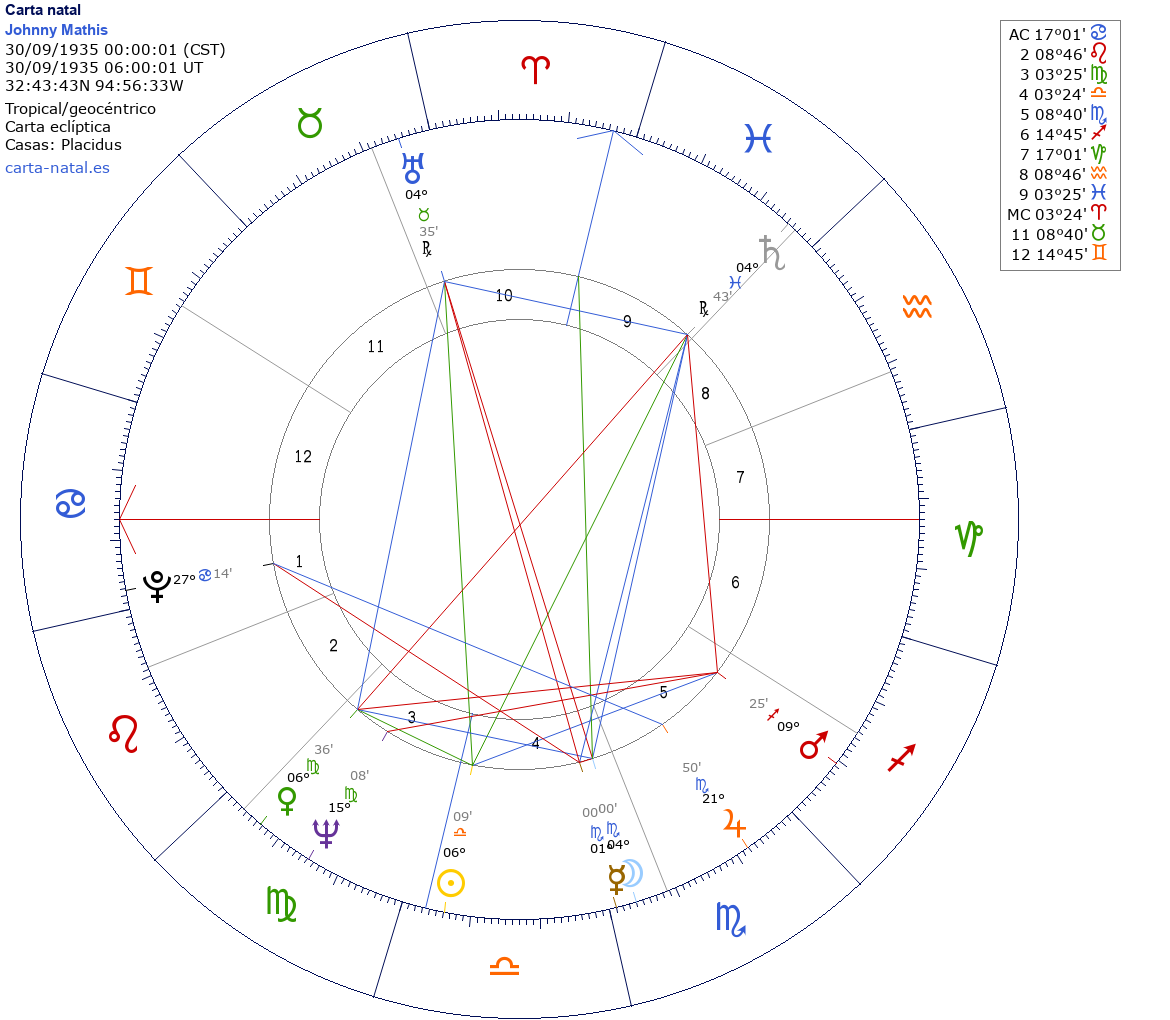 Esta es la carta natal de Johnny Mathis, cantante estadounidense.