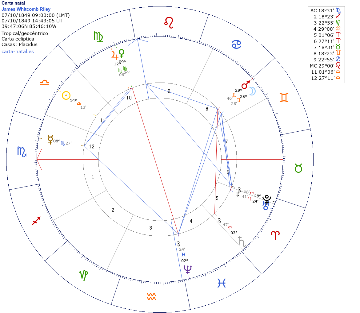 James Whitcomb Riley nació el 7 de Octubre de 1849 a las 09:00:00 en Greenfield (Hancock IN), Estados Unidos