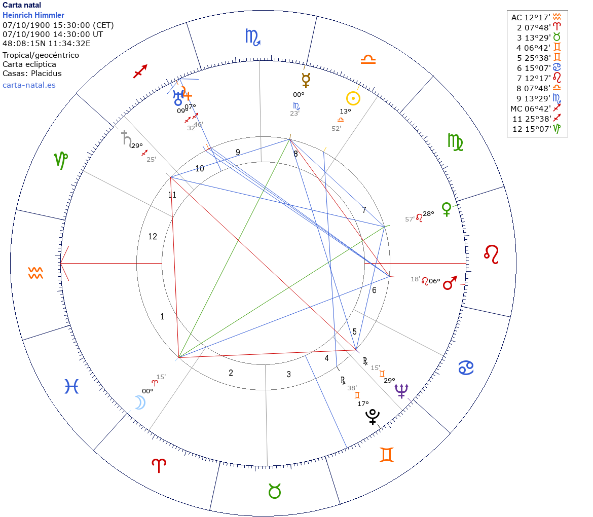Heinrich Himmler nació el 7 de Octubre de 1900 a las 15:30:00 en Muenchen (Baviera), Alemania
