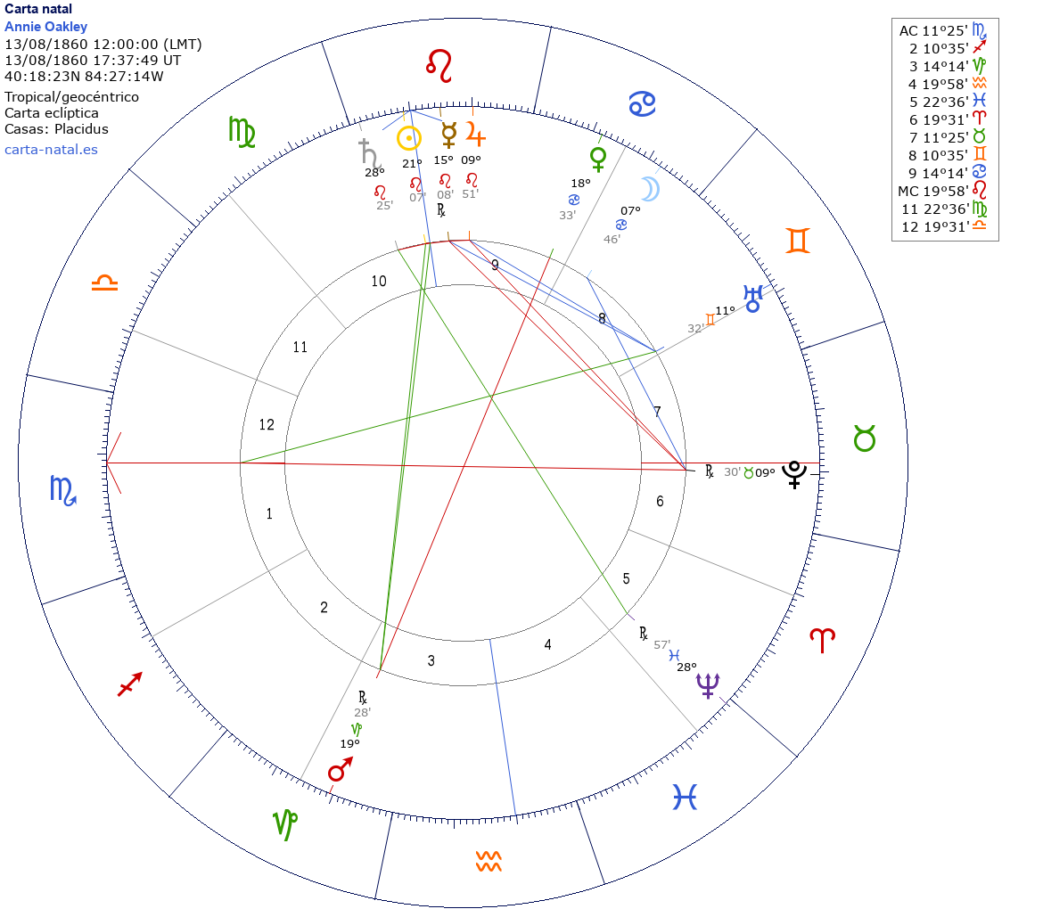 Annie Oakley nació el 13 de Agosto de 1860 a las 12:00:00 en Willowdell (Darke OH), Estados Unidos