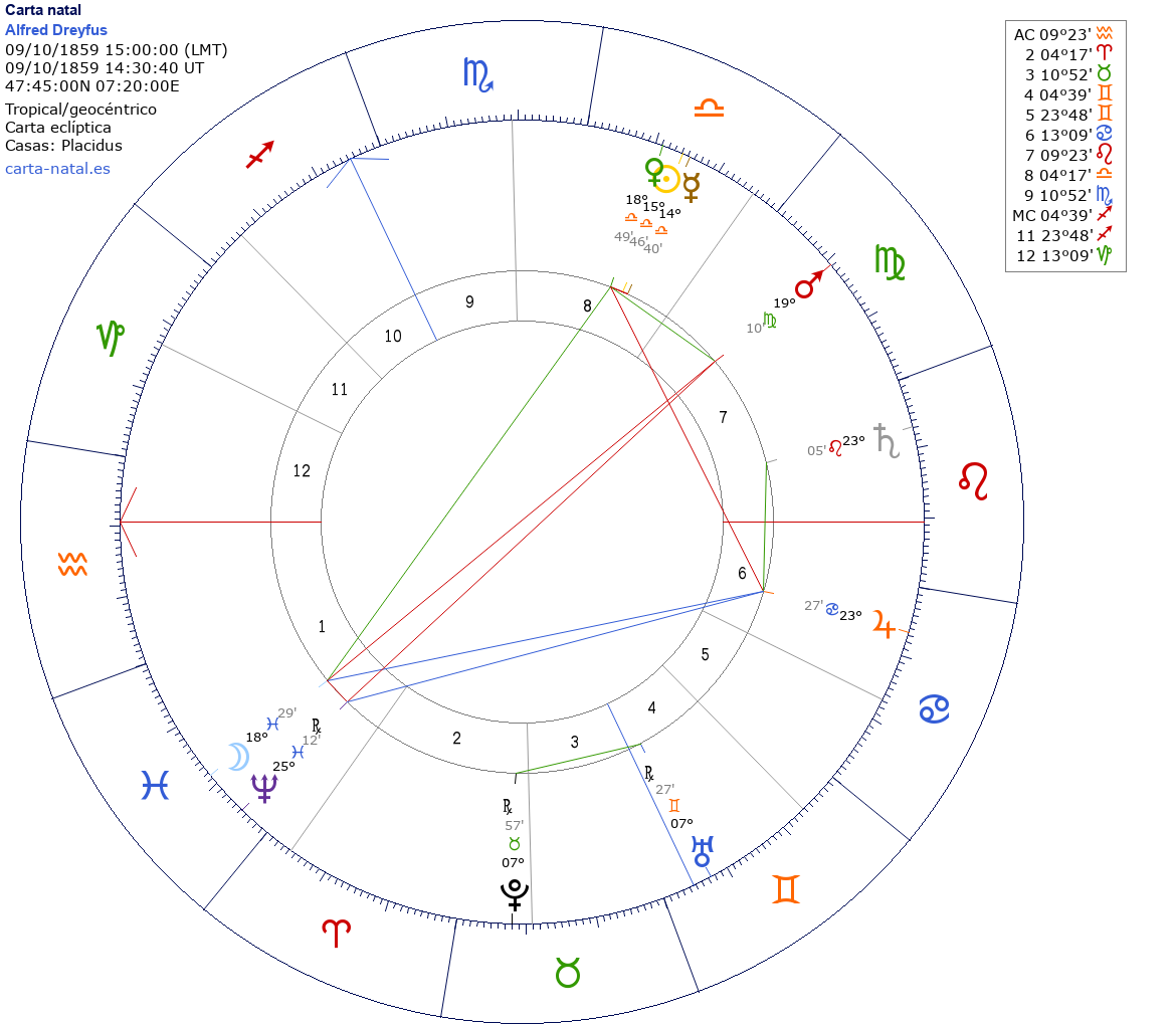 Alfred Dreyfus nació el 9 de Octubre de 1859 a las 15:00:00 en Mulhouse (Alsacia), Francia
