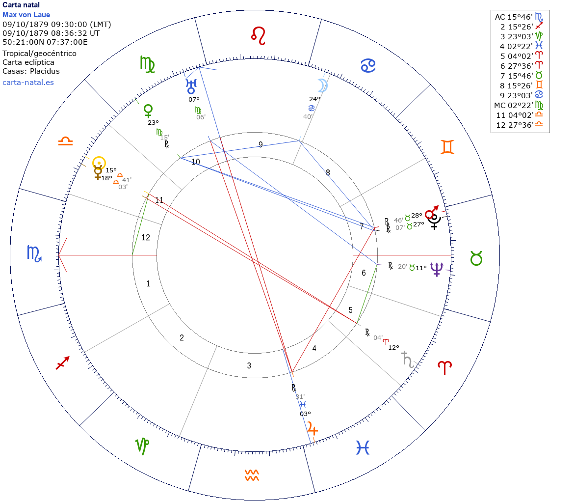 Esta es la carta natal de Max von Laue, físico alemán, premio Nobel de Física en 1914.