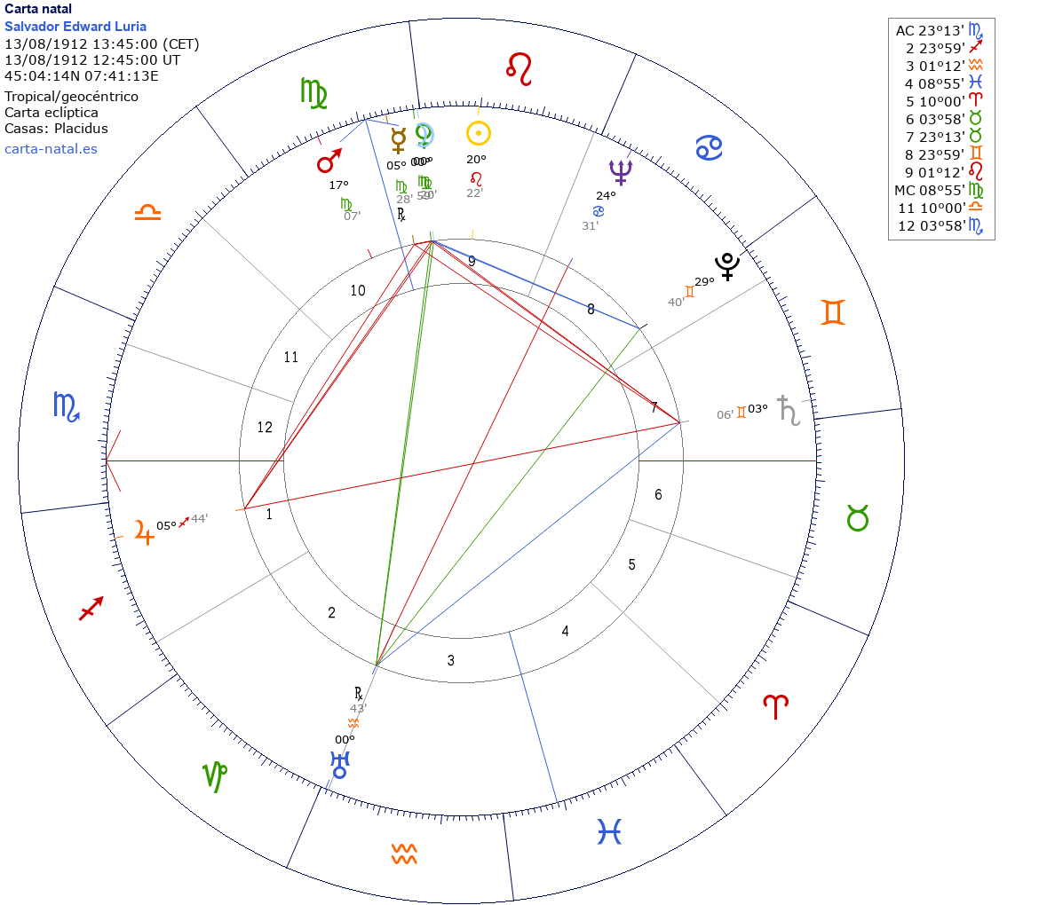 Esta es la carta natal de Salvador Edward Luria, biólogo italiano Premio Nobel de Fisiología o Medicina en 1969.