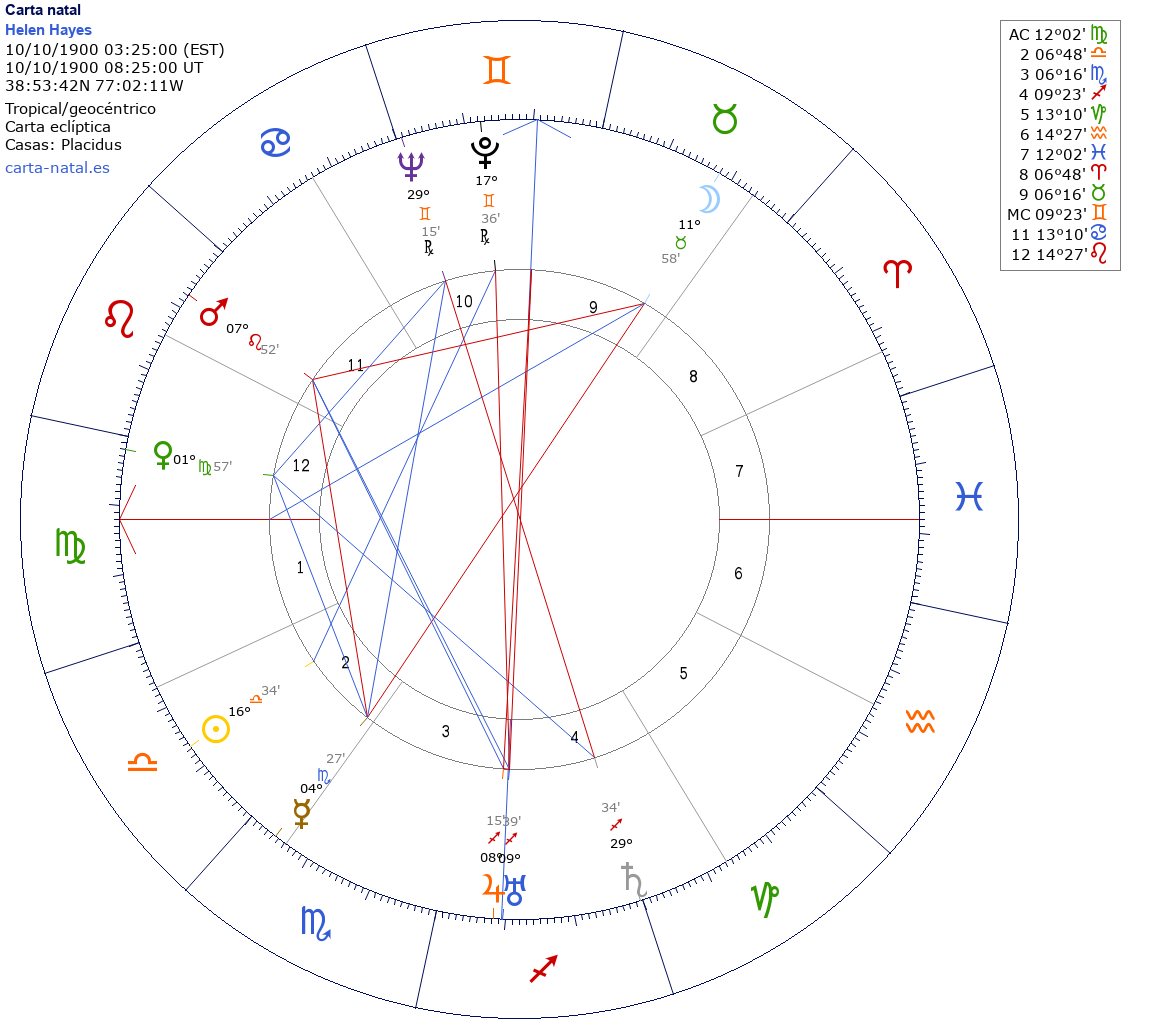 Esta es la carta natal de Helen Hayes, actriz estadounidense. (d. 1993)