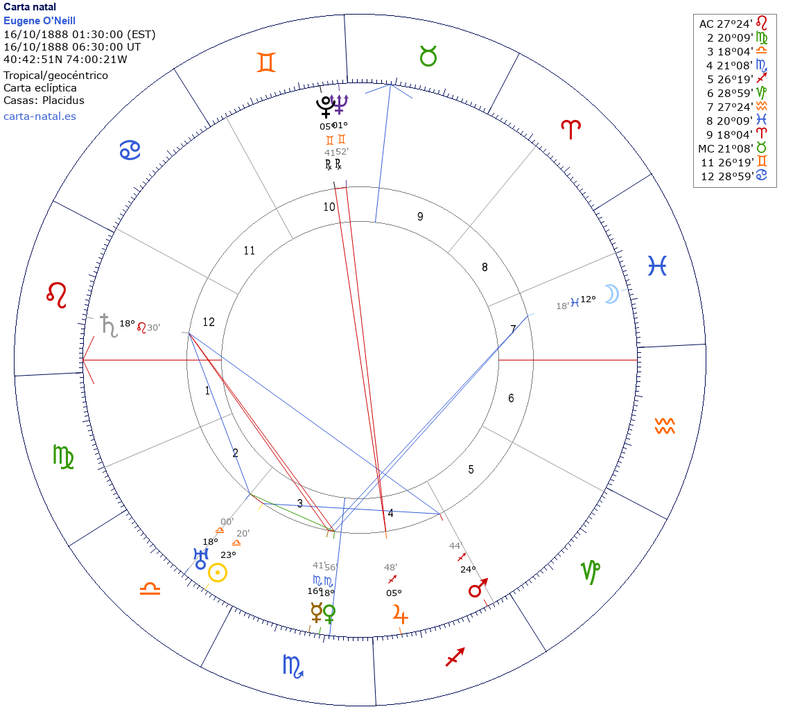 Eugene O'Neill nació el 16 de Octubre de 1888 a las 01:30:00 en New York City (New York NY), Estados Unidos