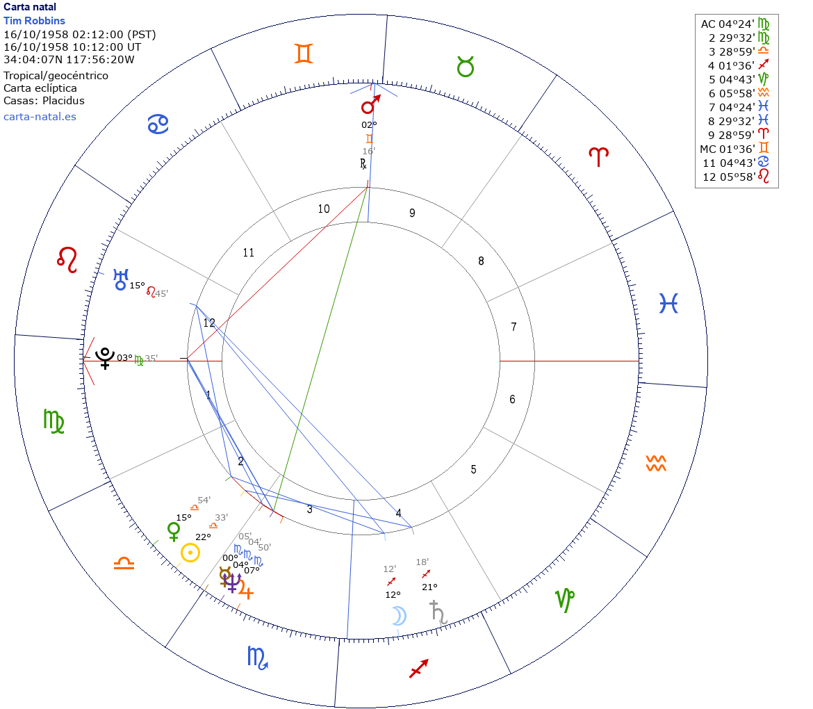 Esta es la carta natal de Tim Robbins, actor estadounidense.