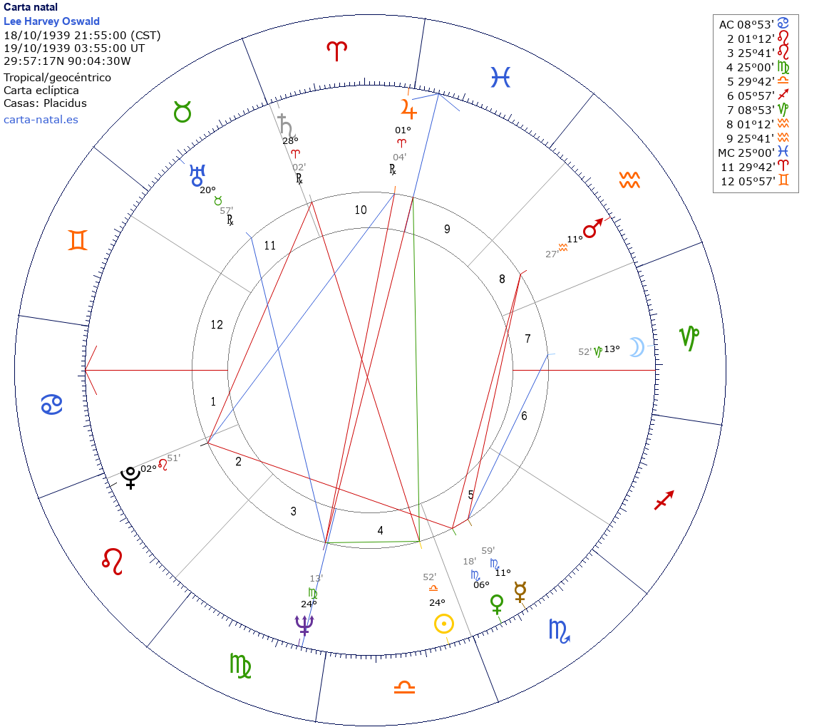 Lee Harvey Oswald nació el 18 de Octubre de 1939 a las 21:55:00 en New Orleans (Orleans LA), Estados Unidos