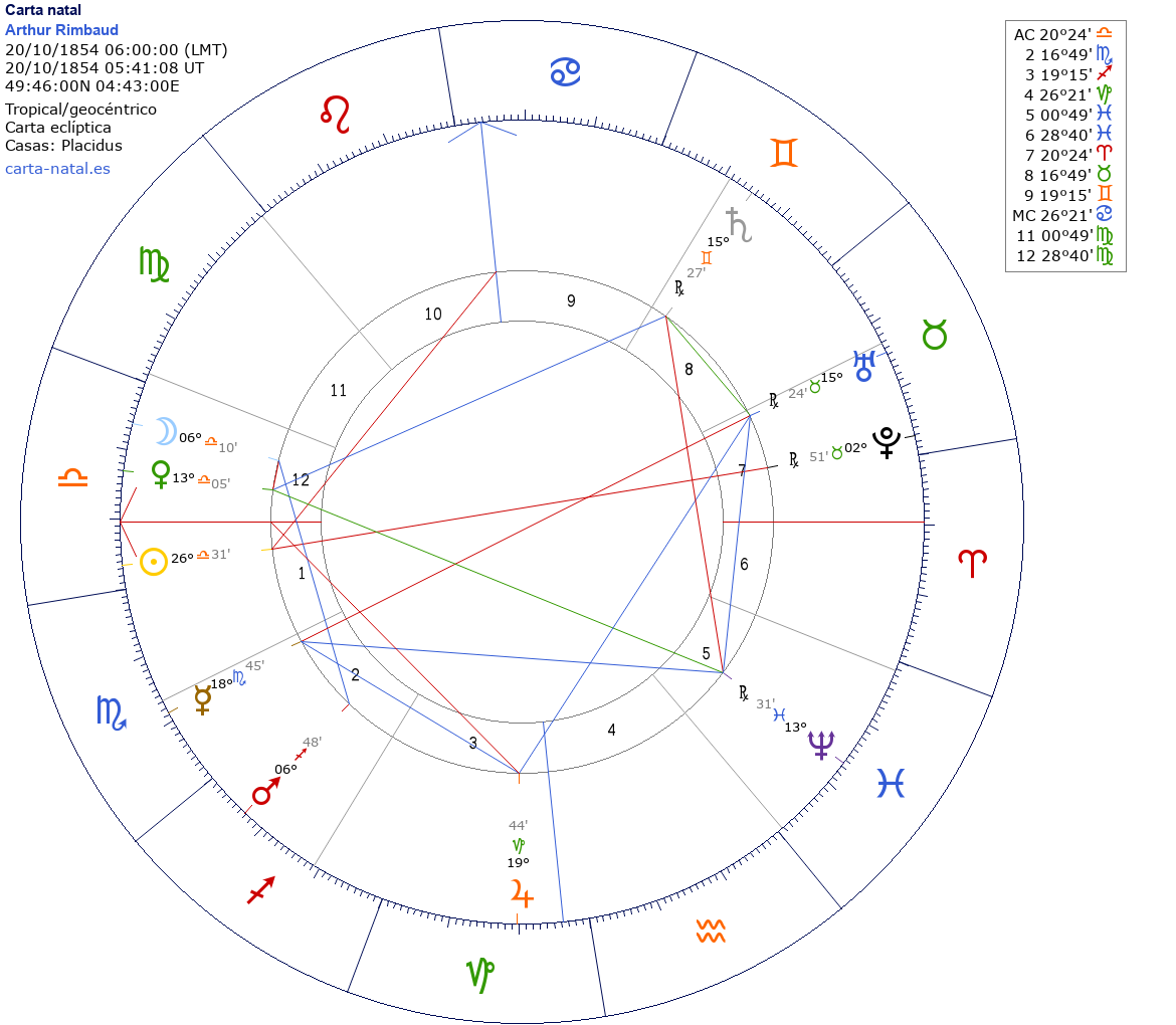 Arthur Rimbaud nació el 20 de Octubre de 1854 a las 06:00:00 en Charleville-Mezieres (Champaña-Ardenas), Francia