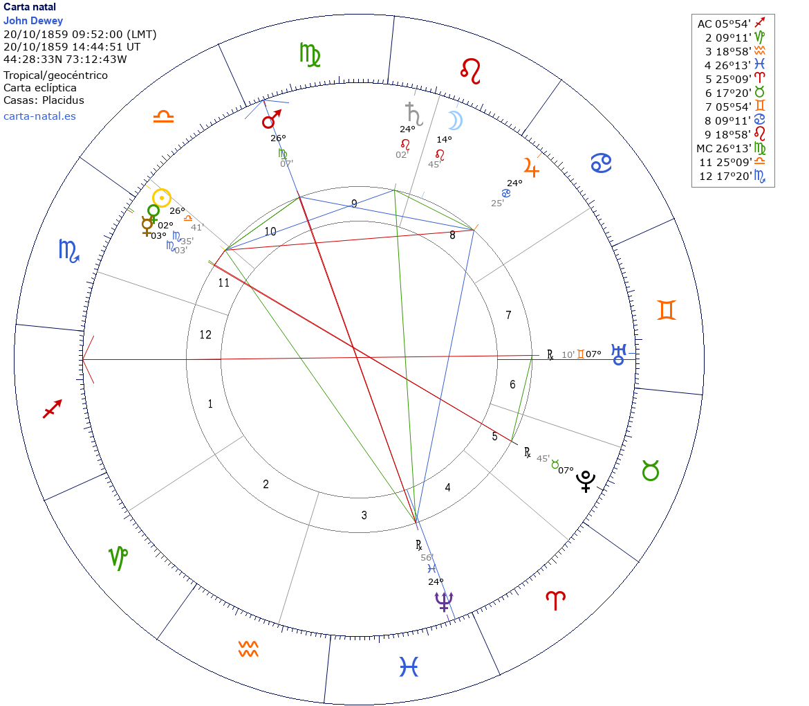 John Dewey nació el 20 de Octubre de 1859 a las 09:52:00 en Burlington (Chittenden VT), Estados Unidos