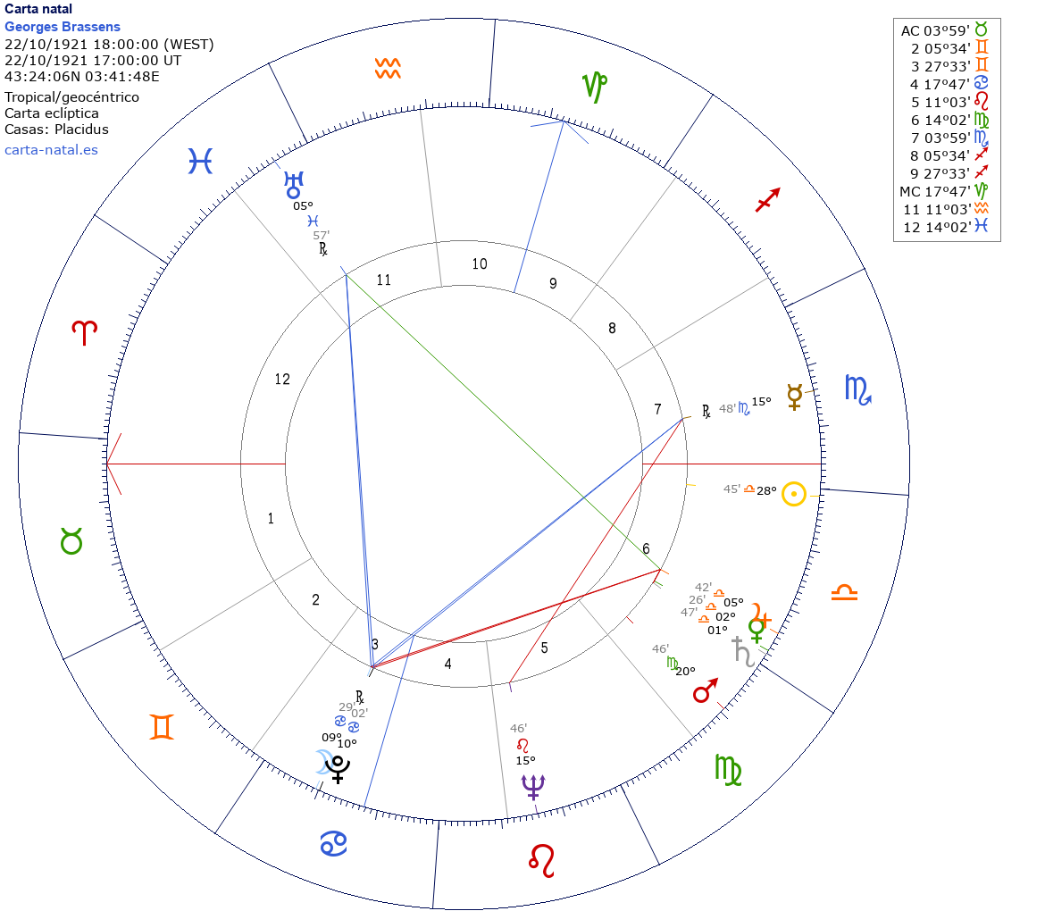Georges Brassens nació el 22 de Octubre de 1921 a las 18:00:00 en Sete (Languedoc-Roussillon), Francia