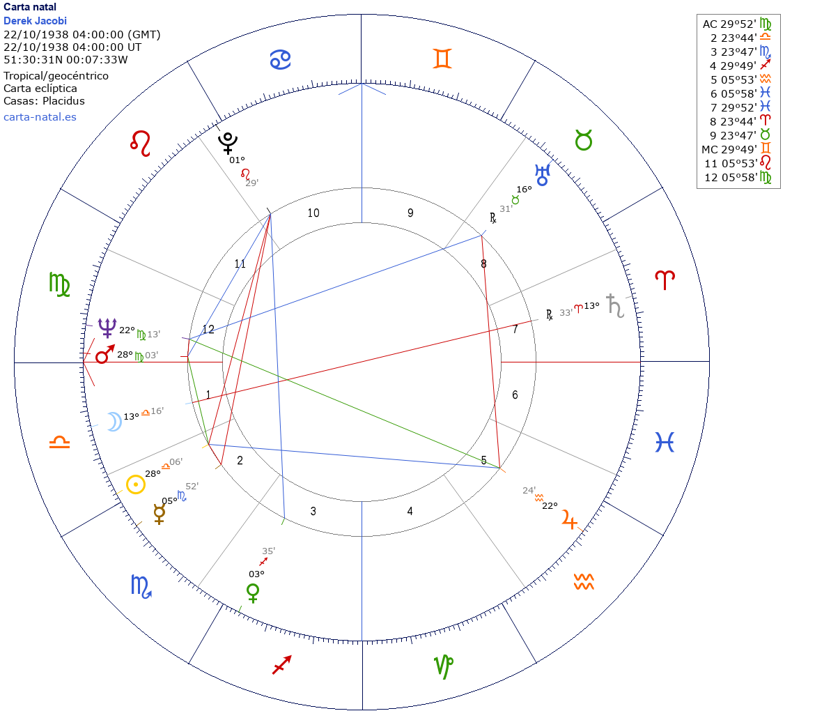 Esta es la carta natal de Derek Jacobi, actor inglés.