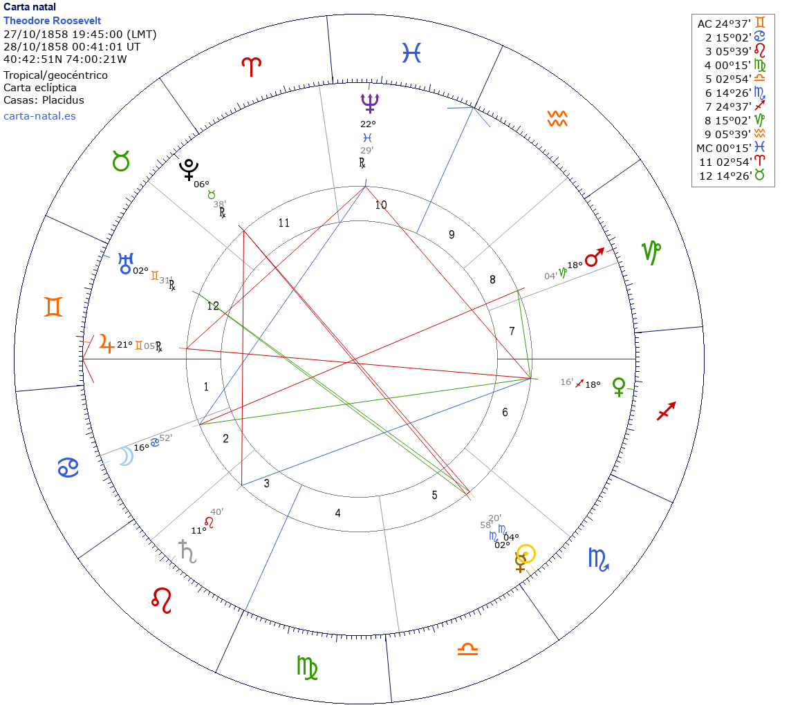 Theodore Roosevelt nació el 27 de Octubre de 1858 a las 19:45:00 en New York City (New York NY), Estados Unidos