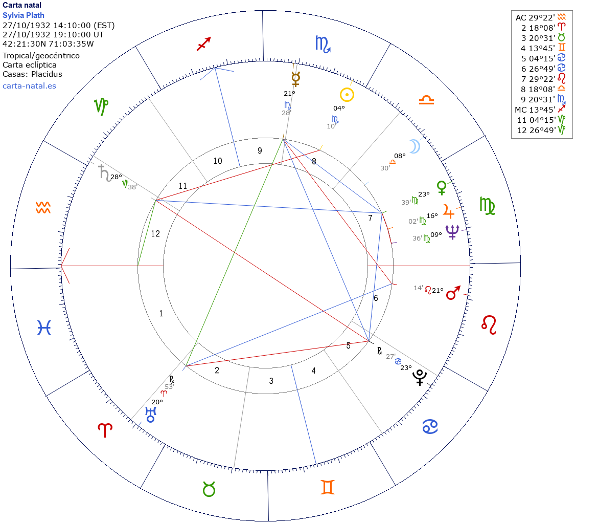 Sylvia Plath nació el 27 de Octubre de 1932 a las 14:10:00 en Boston (Suffolk MA), Estados Unidos