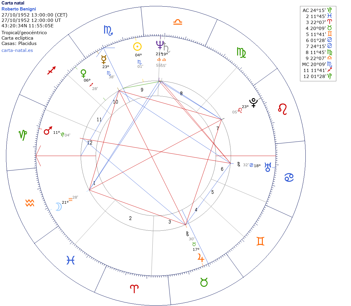 Esta es la carta natal de Roberto Benigni, actor y director italiano.