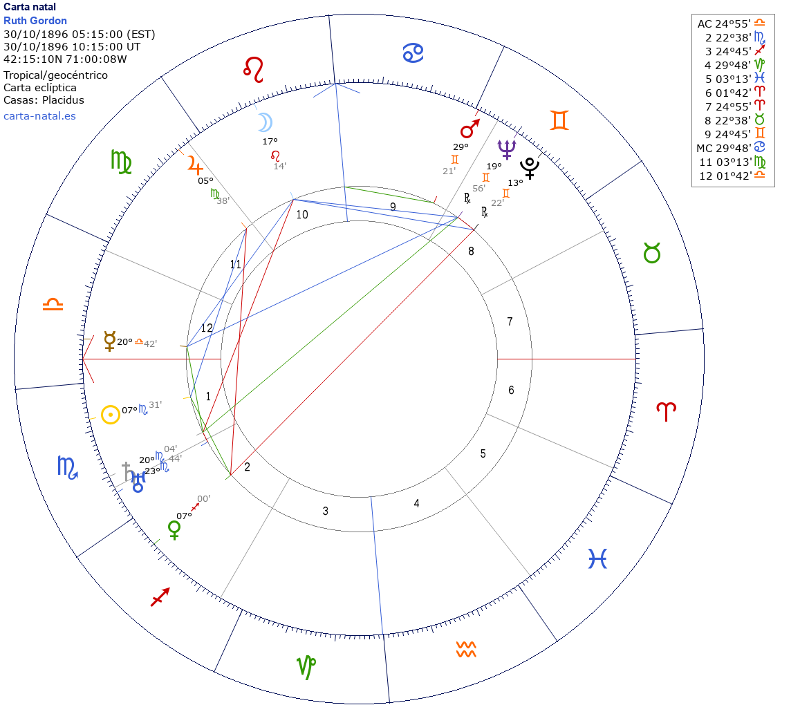 Esta es la carta natal de Ruth Gordon, actriz estadounidense.