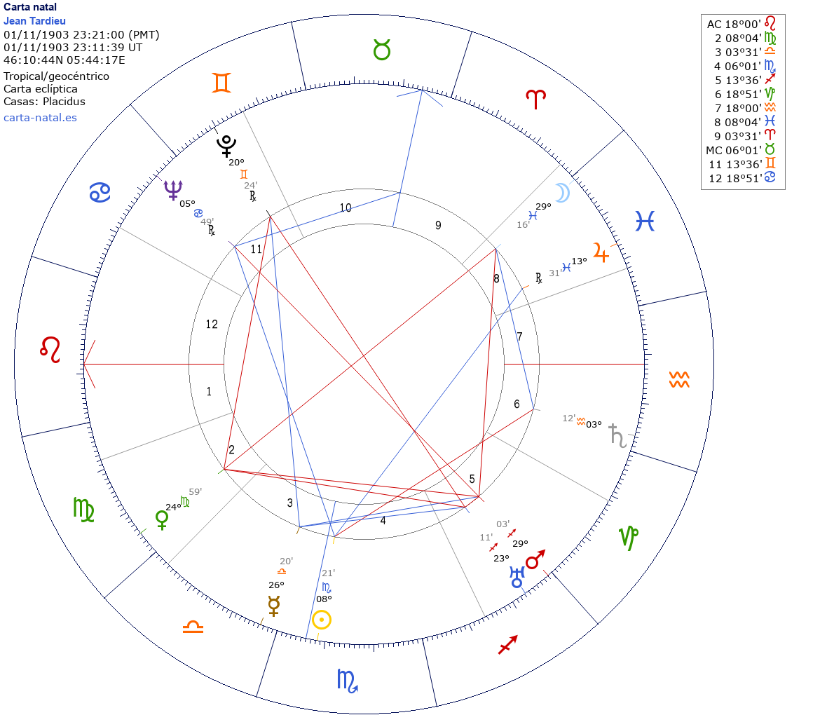 Jean Tardieu nació el 1 de Noviembre de 1903 a las 23:21:00 en Saint-Germain-de-Joux (Ródano-Alpes), Francia