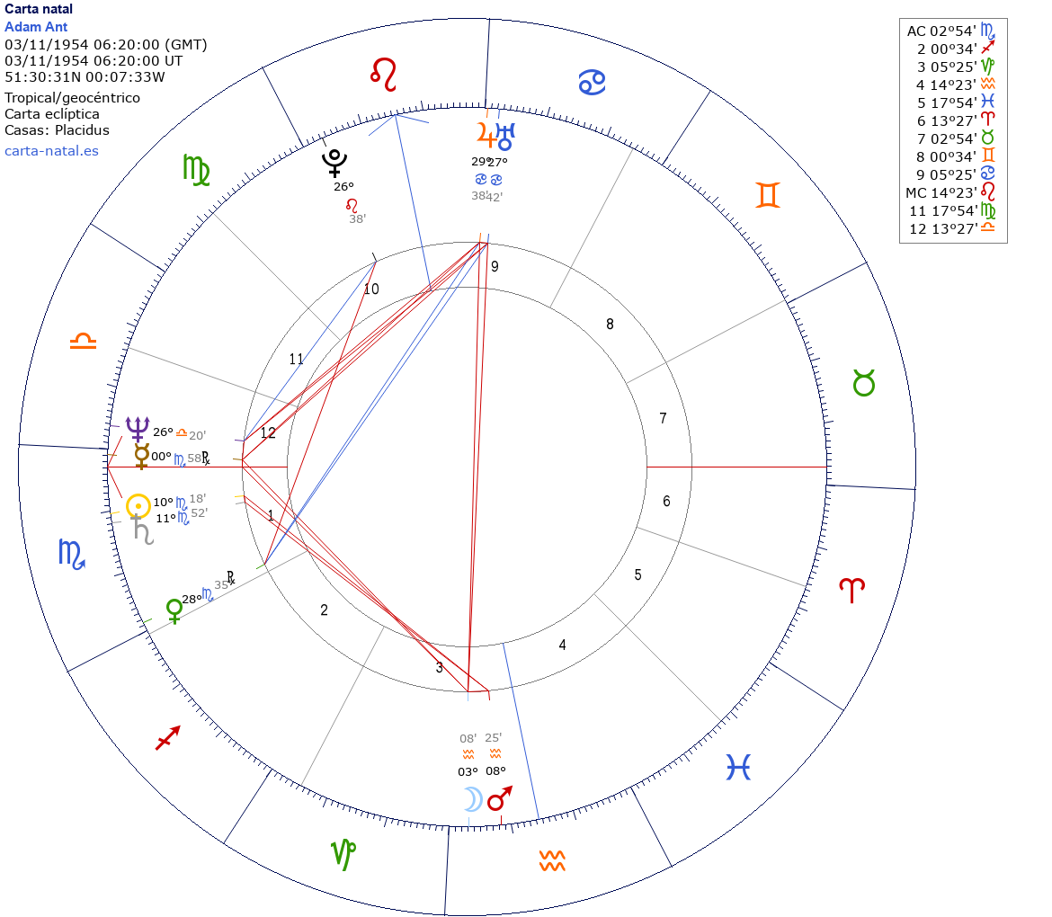 Esta es la carta natal de Adam Ant, músico inglés (Adam and the Ants).