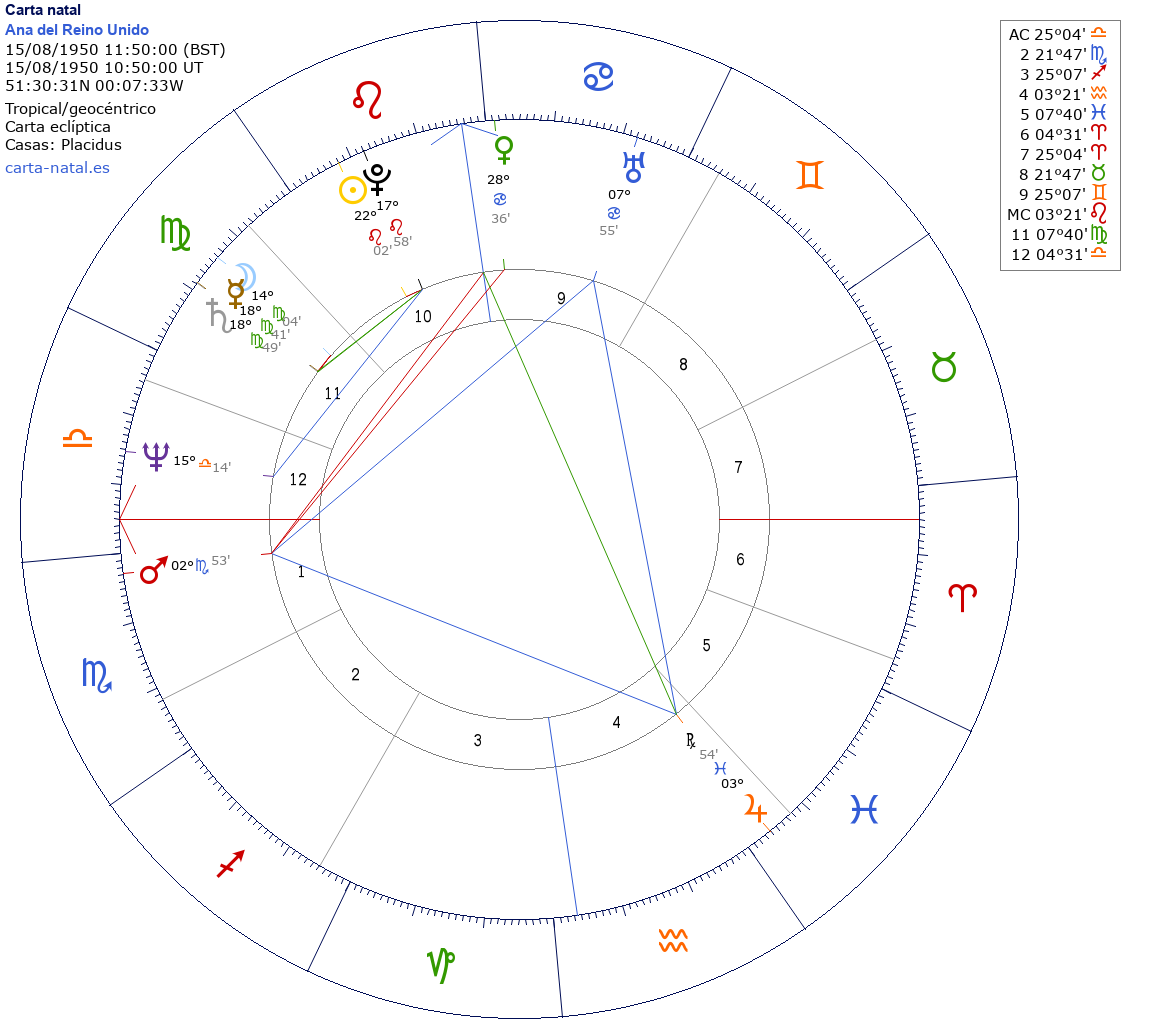 Esta es la carta natal de Anne Elizabeth Alice Louise, Ana Windsor, Princesa real del Reino Unido.
