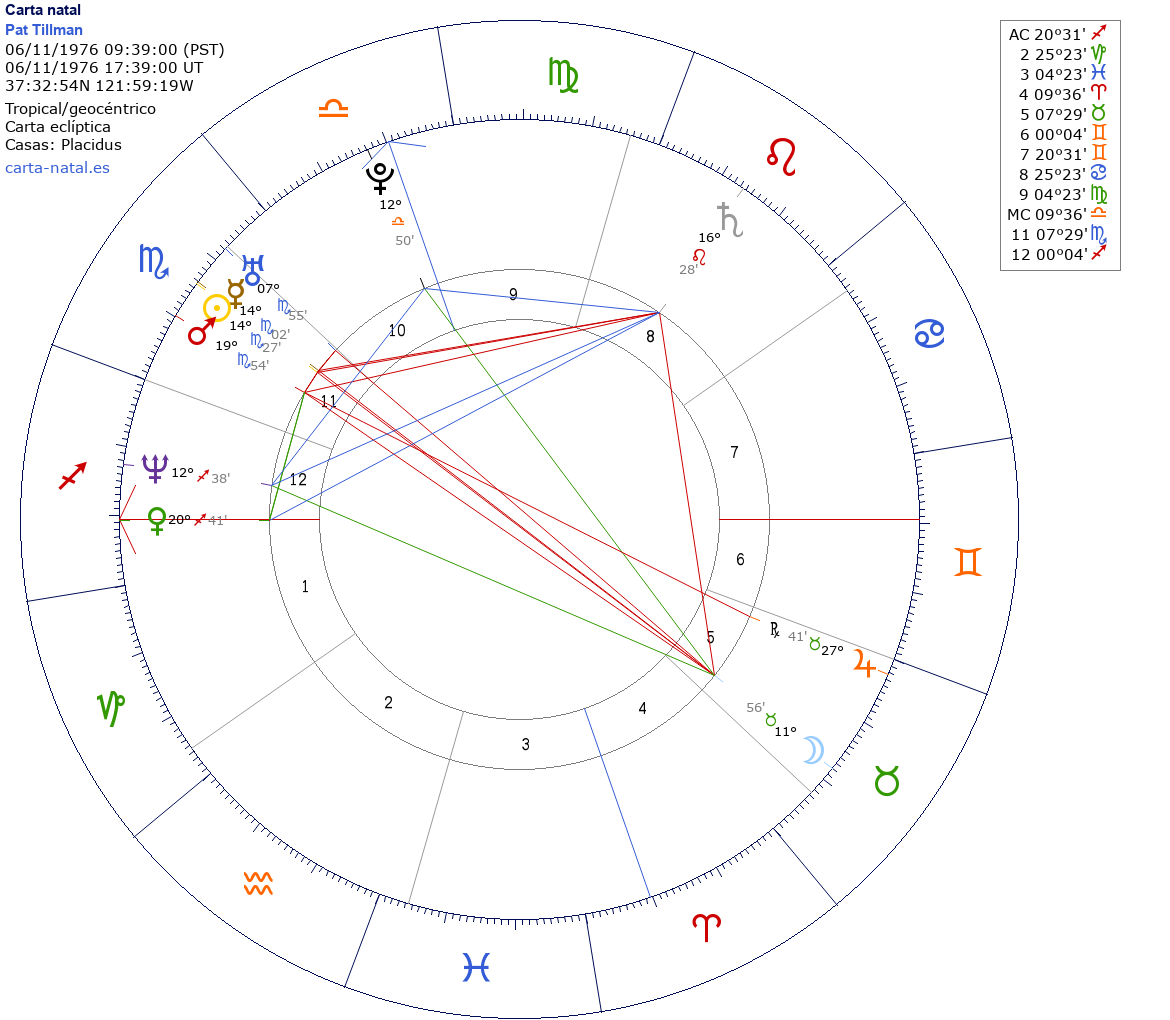 Pat Tillman nació el 6 de Noviembre de 1976 a las 09:39:00 en Fremont (Alameda CA), Estados Unidos