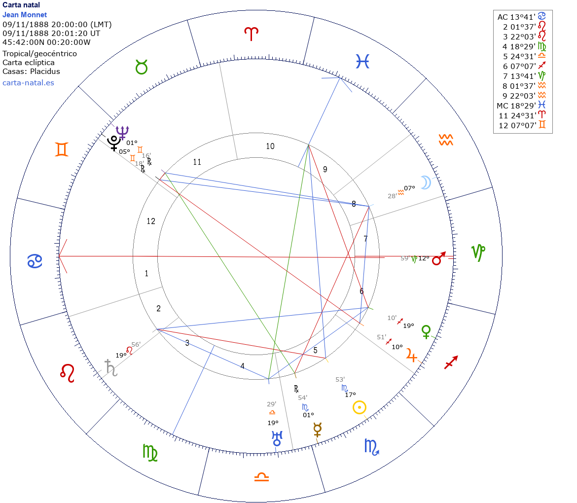 Jean Monnet nació el 9 de Noviembre de 1888 a las 20:00:00 en Cognac (Poitou-Charentes), Francia
