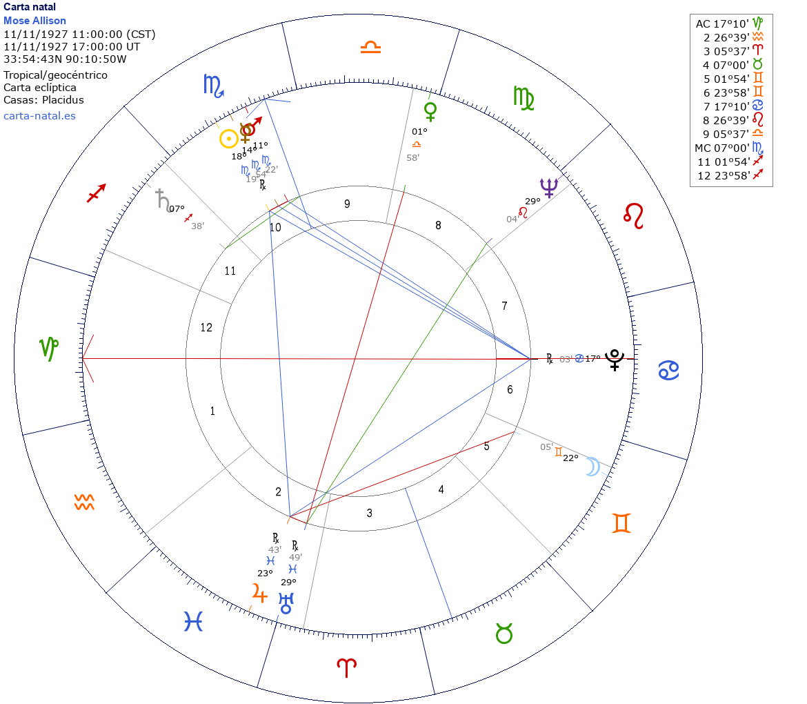 Esta es la carta natal de Mose Allison, pianista de jazz estadounidense.