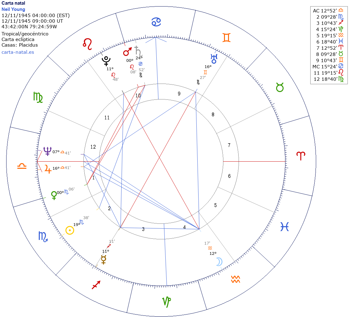 Esta es la carta natal de Neil Young, cantante y compositor canadiense.
