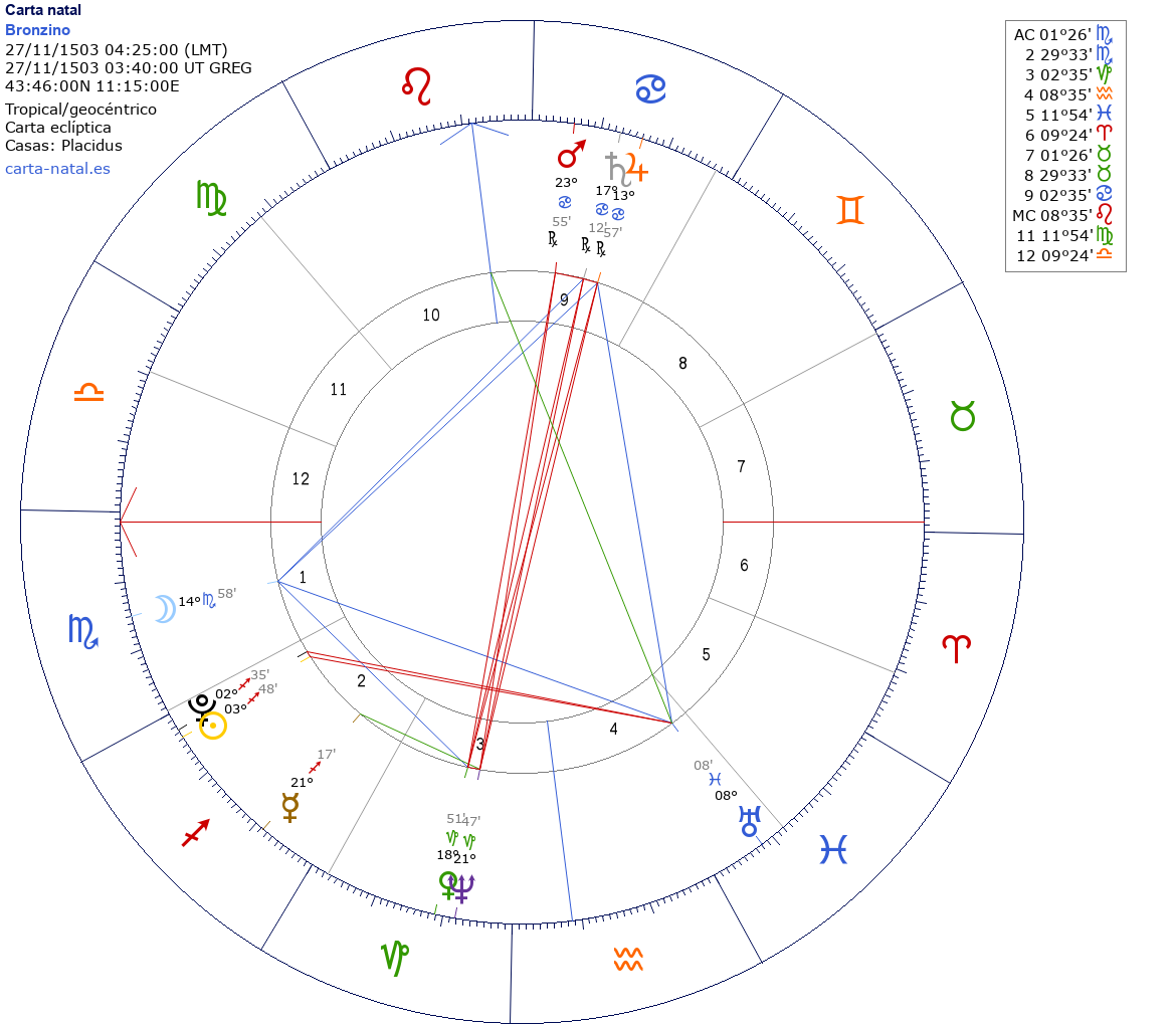 Bronzino nació el 17 de Noviembre de 1503 a las 04:25:00 en Florence (Firenze), Italia