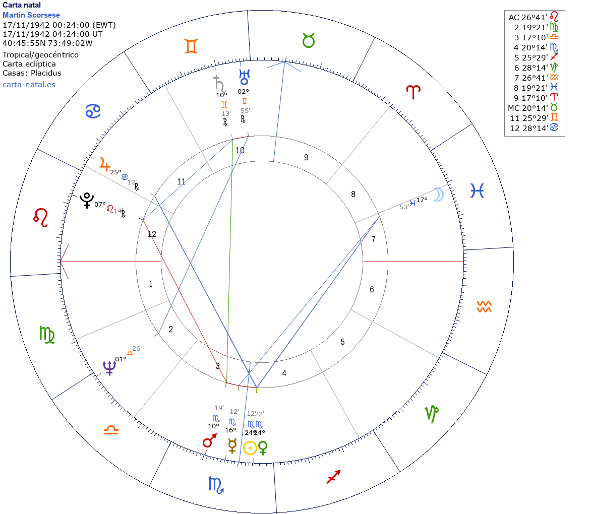 Esta es la carta natal de Martin Scorsese, director de cine estadounidense.