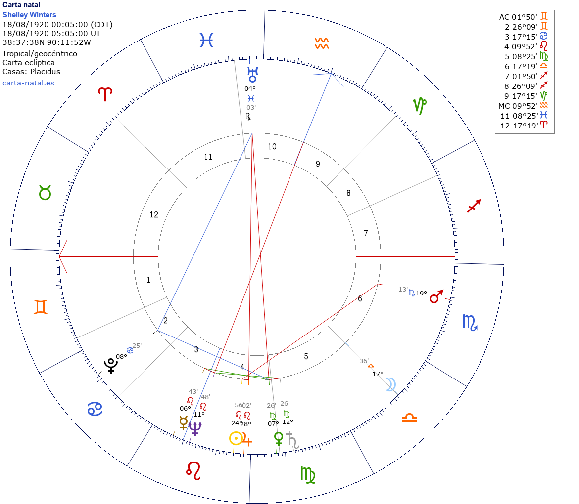 Esta es la carta natal de Shelley Winters, actriz estadounidense. (f. 2006)