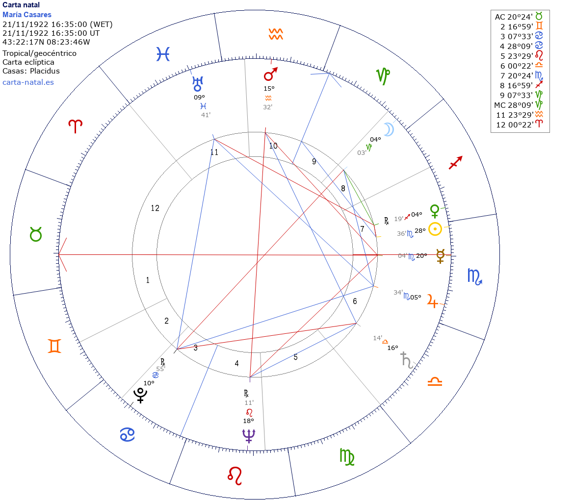 Esta es la carta natal de María Casares, actriz española.