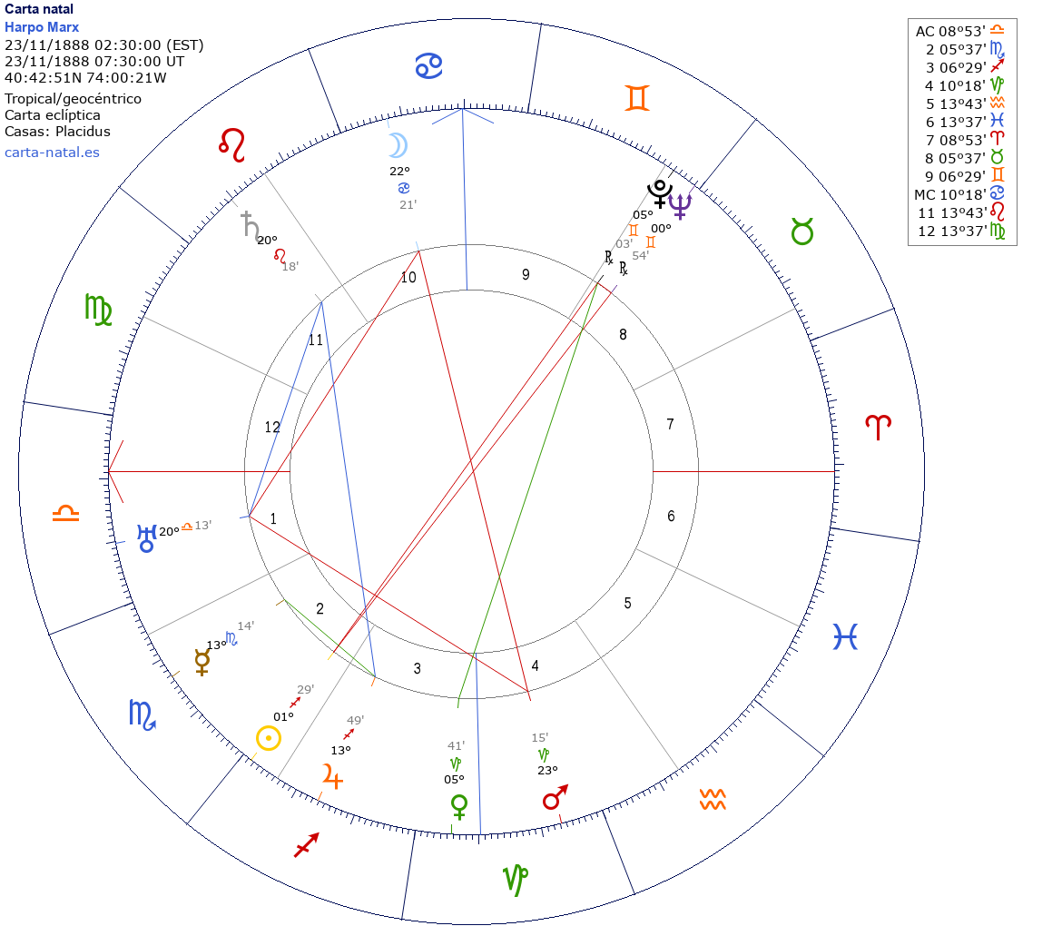 Esta es la carta natal de Harpo Marx actor estadounidense.