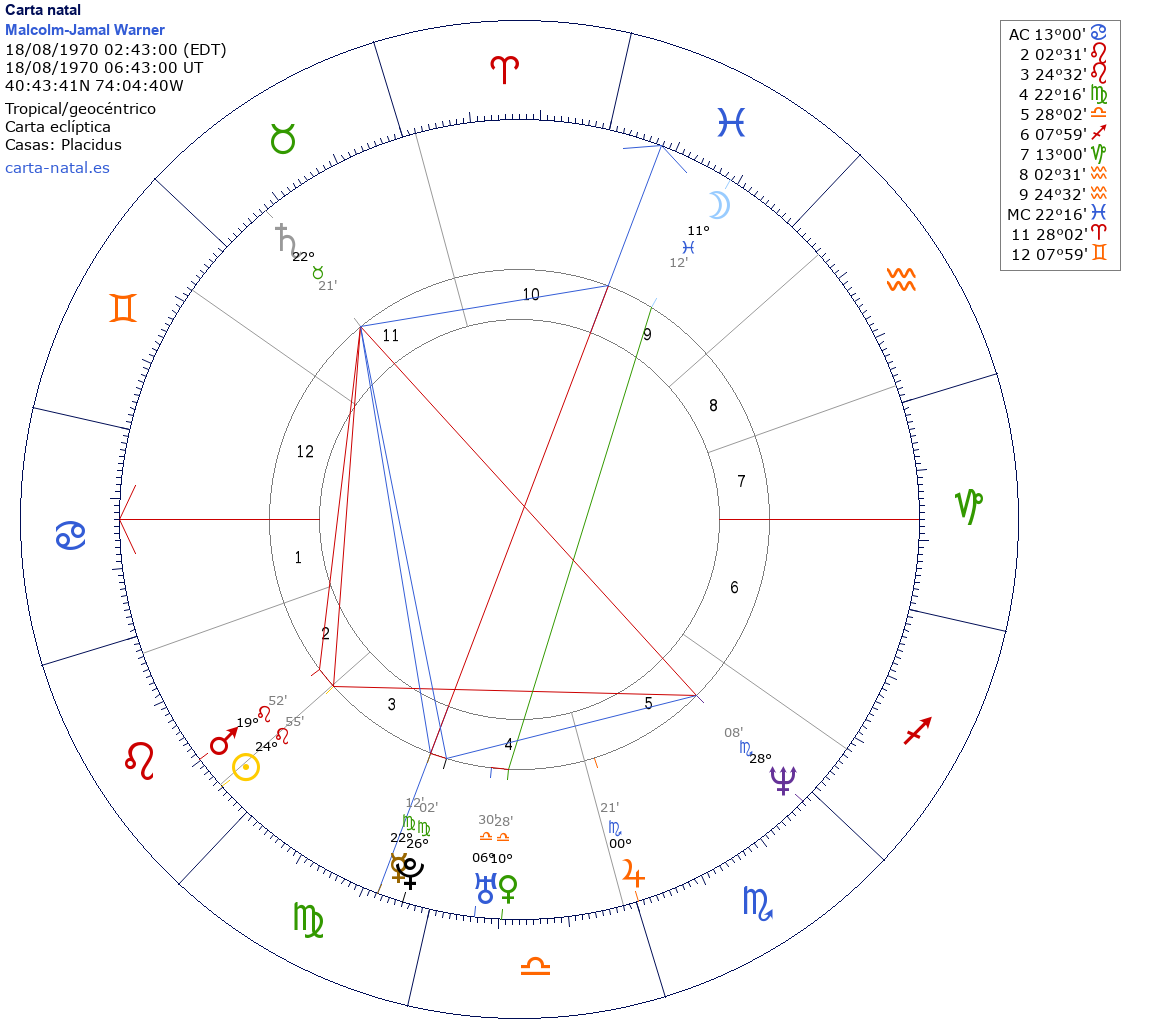 Esta es la carta natal de Malcolm-Jamal Warner, actor estadounidense.