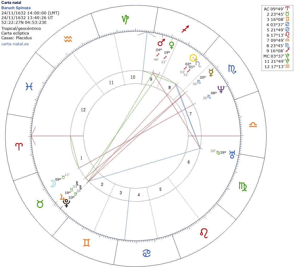 Baruch Spinoza nació el 24 de Noviembre de 1632 a las 14:00:00 en Amsterdam (North Holland), Países Bajos
