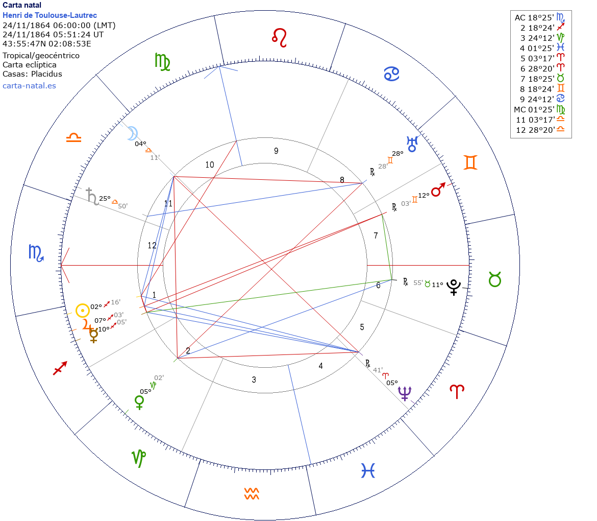 Henri de Toulouse-Lautrec nació el 24 de Noviembre de 1864 a las 06:00:00 en Albi (Mediodía-Pirineos), Francia